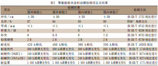 制定標準檢測樣板,檢測標準按照國家推薦標準,檢測以不同飽和羥基聚酯制成的聚氨酯粉末涂料涂膜性能,結果見表2。