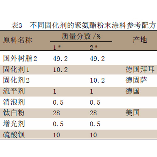 聚氨酯粉末涂料的固化劑現在主要還是采用進口的,在此選擇了德國拜耳的2147不封閉型的異氰酸酯為固化劑1和德固薩的b-1530封閉型的異氰酸酯為固化劑2作為實驗用的固化劑,樹脂選用上述試驗的國外樹脂2,其參考配方見表3。